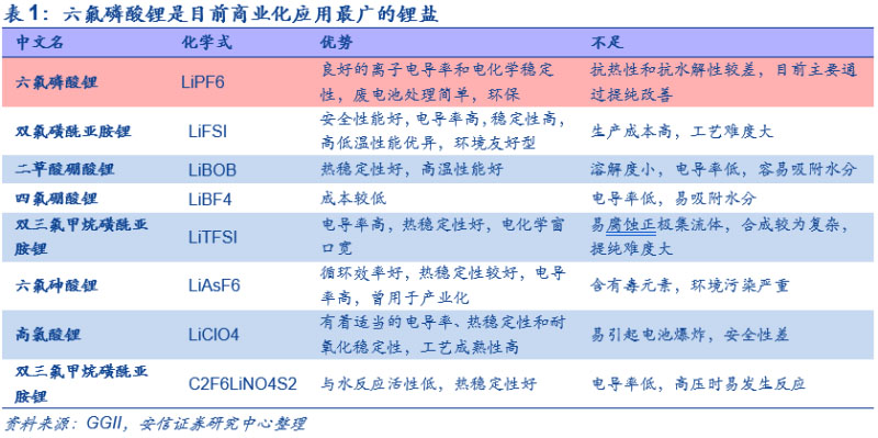 六氟磷酸鋰是電解液的重要組成部分,短中期內(nèi)可替代性低。電解液由高純?nèi)苜|(zhì)、溶劑和高純添加劑按照一定的比例配制而成,其核心競爭力在于工藝控制和配方。由于六氟磷酸鋰在導(dǎo)電率、穩(wěn)定性和環(huán)保上的優(yōu)勢,能夠顯著影響電解液的離子電導(dǎo)率、電化學(xué)穩(wěn)定窗口、高低溫穩(wěn)定性和氧化穩(wěn)定性等重要性能,因此目前被作為商業(yè)化應(yīng)用最廣的鋰鹽,在短中期內(nèi)可替代性較低,傳統(tǒng)鋰鹽高氯酸鋰、六氟砷酸鋰等,均存在難以克服的性能缺陷,難以實(shí)現(xiàn)大規(guī)模商業(yè)化應(yīng)用。新型鋰鹽中雙氟磺酰亞胺鋰電導(dǎo)率、穩(wěn)定性、高低溫性能等均較為理想,是最具商業(yè)化應(yīng)用前景的鋰鹽,但是其加工難度較大,成本和價(jià)格較高,對電解液及鋰電池成本影響較大,尚難以實(shí)現(xiàn)大規(guī)模量產(chǎn)和應(yīng)用,目前主要作為添加劑少量使用。