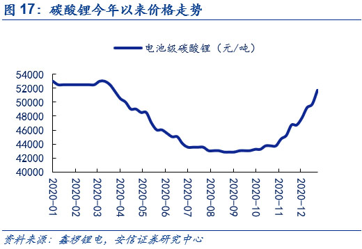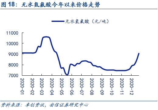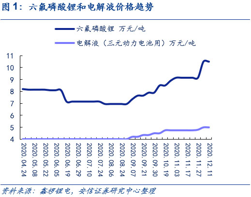 下游需求景氣疊加冬季原料供應(yīng)偏緊,短期內(nèi)碳酸鋰和無水氫氟酸價(jià)格均底部上行。在新能源車下半年景氣度提升的情況下,用于生產(chǎn)新能源車電池電解液鋰鹽六氟磷酸鋰的碳酸鋰和無水氫氟酸的需求持續(xù)增長(其中碳酸鋰還被用于生產(chǎn)正極磷酸鐵鋰)。而在供給端,由于冬季氣溫驟降,且2020年較往年溫度更低,碳酸鋰上游包括青海在內(nèi)的多個(gè)鹽湖的鋰企下調(diào)產(chǎn)量預(yù)期。與此同時(shí),無水氫氟酸上游螢石粉價(jià)格因冬季的來臨,市場貨源也逐步減少。供不應(yīng)求的局面使得原料成本上漲,在下游需求景氣的情況下,推動碳酸鋰和無水氫氟酸價(jià)格底部上行。