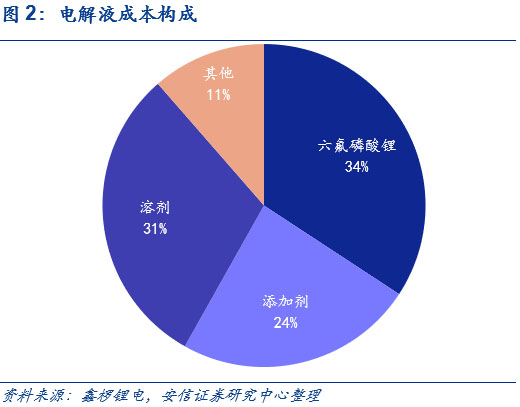 六氟磷酸鋰在電解液成本中占比較高,價(jià)格變動影響電解液價(jià)格走勢。電解液原材料成本占據(jù)較大比重,其中原材料主要由溶劑、添加劑和鋰鹽構(gòu)成,鋰鹽目前以六氟磷酸鋰為主。從電解液的成本來看,根據(jù)鑫欏鋰電近期的價(jià)格統(tǒng)計(jì),結(jié)合電解液的材料用量測算,以最新的價(jià)格來看,六氟磷酸鋰目前在電解液的成本構(gòu)成中超30%;由于成本占比較高,六氟磷酸鋰的價(jià)格變動也顯著影響電解液的價(jià)格走勢。