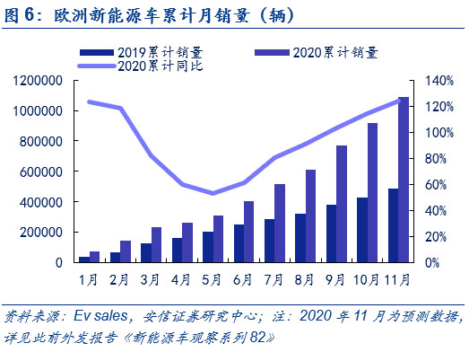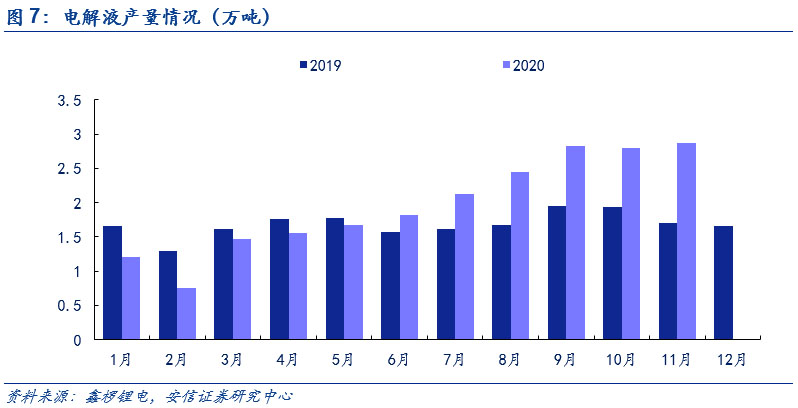 下半年需求端高增長帶來漲價(jià)契機(jī)。中國來看,累計(jì)數(shù)據(jù)上來看, 2020年1-11月,國內(nèi)新能源汽車產(chǎn)銷分別為111.9萬輛和110.9萬輛,同比分別下降0.1%和增長3.9%,銷量實(shí)現(xiàn)由負(fù)轉(zhuǎn)正,上半年受到疫情影響產(chǎn)銷不及預(yù)期,但下半年在產(chǎn)品力持續(xù)驅(qū)動下產(chǎn)銷超預(yù)期增長。歐洲方面,盡管上半年在疫情影響下,歐洲新能源車銷量實(shí)現(xiàn)了V字走勢,但自下半年以來,碳排放的倒逼和各國電動化政策的加碼助推新能源車銷量持續(xù)上行。全球新能源車市下半年以來的持續(xù)高增長已為上游的電解液和六氟磷酸鋰帶來漲價(jià)契機(jī)。