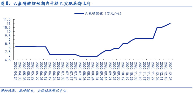 六氟磷酸鋰短期內(nèi)價(jià)格已底部上行。在下半年新能源車需求端顯著回暖和電解液的需求大幅度增長的情況下,帶動了六氟磷酸鋰需求增長,疊加原材料碳酸鋰價(jià)格上探,推動六氟磷酸鋰企業(yè)議價(jià)權(quán)增加。在此基礎(chǔ)上,六氟磷酸鋰短期價(jià)格已實(shí)現(xiàn)底部上行。根據(jù)鑫欏鋰電,目前圣誕節(jié)前后六氟磷酸鋰的市場價(jià)格已經(jīng)增長到了11萬元/噸。