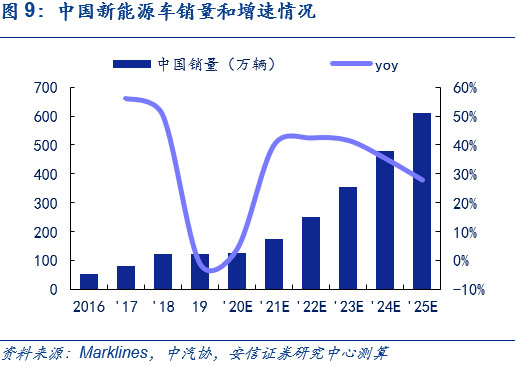 中國方面,產(chǎn)品驅(qū)動推動中國新能源車市場,2025年銷售量將超600萬輛,6年CAGR達(dá)31%。目前,中國市場正從政策驅(qū)動逐步轉(zhuǎn)向產(chǎn)品驅(qū)動,結(jié)合Marklines和中汽協(xié)的相關(guān)預(yù)測,考慮到大眾、奔馳和通用為首的傳統(tǒng)車企平臺化車型持續(xù)布局、造車新勢力顛覆傳統(tǒng)的產(chǎn)品驅(qū)動力持續(xù)發(fā)酵和特斯拉Model Y等產(chǎn)品在未來的潛在爆款效應(yīng),以2019年為基年,我們預(yù)計(jì)中國今年全年新能源車銷量約125萬輛;明年銷量近180萬輛,同比增長超40%;2025年達(dá)611萬輛,6年CAGR達(dá)31%,2025年新能源車滲透率超20%,測算過程可參見此前外發(fā)周報(bào)《歐洲電車逆勢增長超預(yù)期,中國產(chǎn)品力驅(qū)動持續(xù)凸顯》。