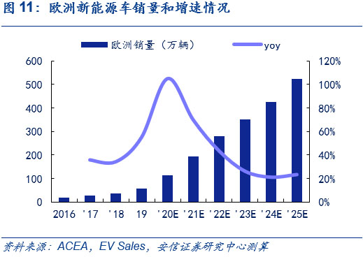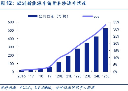 歐洲方面,預(yù)計(jì)歐洲電動車高增長態(tài)勢將持續(xù),2025年銷售量將超500萬輛,6年CAGR達(dá)45%。目前,在歐洲碳排放法規(guī)的倒逼和高補(bǔ)貼政策的推動下,新能源車在今年快速發(fā)展,結(jié)合ACEA和Ev Sales的相關(guān)預(yù)測,考慮到歐洲對于新能源車的高補(bǔ)貼政策將在近年來延續(xù)、大眾、奔馳為首的傳統(tǒng)車企平臺化車型持續(xù)布局和特斯拉歐洲工廠的建立,以2019年為基年,我們預(yù)計(jì)歐洲今年全年新能源車銷量近120萬輛;明年銷量將近190萬輛,同比增長近70%;2025年達(dá)520萬輛,6年CAGR達(dá)45%,2025年新能源摻和滲透率超30%,測算過程可參見此前外發(fā)周報(bào)《歐洲電車逆勢增長超預(yù)期,中國產(chǎn)品力驅(qū)動持續(xù)凸顯》。