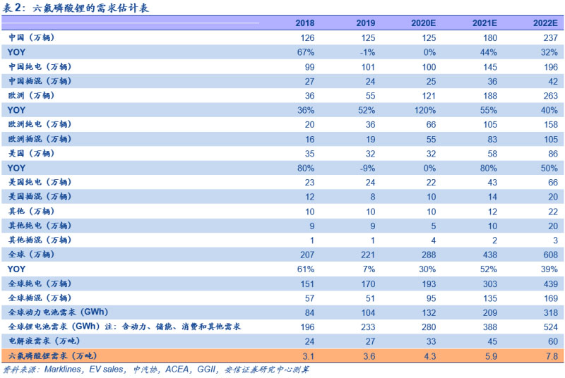 預(yù)計(jì)明后年六氟磷酸鋰需求分別為5.9/7.8萬噸,同比分別增長38%/33%。根據(jù)我們的測算,我們預(yù)計(jì)2020年全球新能源汽車銷量合計(jì)280萬輛,其中中國125萬輛,美國32萬輛,歐洲121萬輛,對應(yīng)動力電池需求132GWh;疊加儲能、消費(fèi)和其他需求;我們預(yù)計(jì)2020年全球鋰電池需求量合計(jì)280GWh。根據(jù)行業(yè)一噸電解液需要0.13噸六氟磷酸鋰的估計(jì),可得出六氟磷酸鋰的需求量為4.3萬噸。而從中期來看,明后年六氟磷酸鋰需求分別為5.9/7.8萬噸,同比分別增長38%/33%。