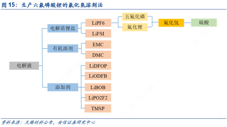 從成本構(gòu)成來看,碳酸鋰、五氯化磷和無水氫氟酸在成本中的占比較大。從六氟磷酸鋰的成本構(gòu)成來看,以多氟多披露數(shù)據(jù)為例來進(jìn)行測算,目前六氟磷酸鋰的單噸使用量中碳酸鋰、五氯化磷和無水氫氟酸分別為0.3/1.4/0.7噸,結(jié)合鑫欏鋰電,卓創(chuàng)咨詢相關(guān)產(chǎn)品價(jià)格,我們得到碳酸鋰、五氯化磷和無水氫氟酸在六氟磷酸鋰中的成本構(gòu)成分別為28%、23%和10%,占比較高。