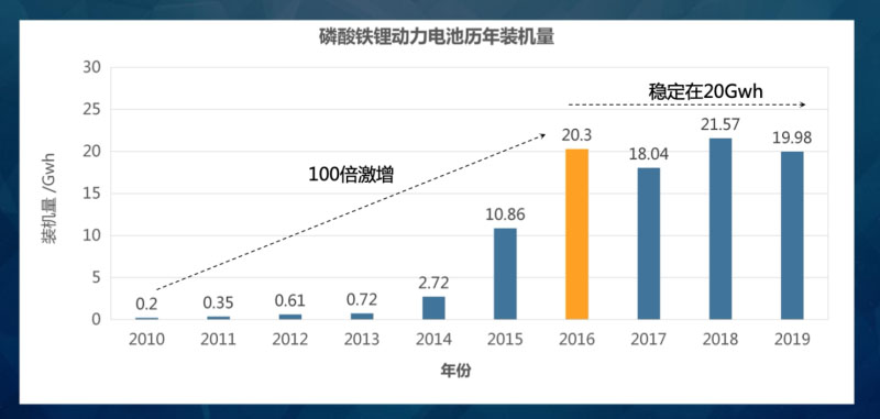 回望磷酸鐵鋰電池在國(guó)內(nèi)的發(fā)展,從裝機(jī)量來看,從2010年的0.2GWh到2016年的20.3GWh,其實(shí)現(xiàn)了7年100倍的激增。到2016年之后,穩(wěn)定在每年20GWh的狀態(tài)。