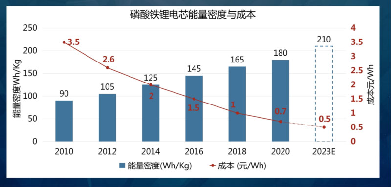 白科預(yù)測(cè),到2023年,磷酸鐵鋰的能量密度增加會(huì)逐步放緩,能接近210Wh/kg,成本則下降至0.5元/Wh。