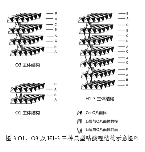 G.Ceder等[5]發(fā)現(xiàn),O3相鈷酸鋰向O1相CoO2轉(zhuǎn)變過程中,存在H1-3的過渡相,該相與O1相及O3相的主要區(qū)別在于Li層的氧八面體與Co層氧八面體的連接方式。O1相結(jié)構(gòu)中,Li層與Co層氧八面體是共面,而O3結(jié)構(gòu)中,兩種八面體為共棱;H1-3結(jié)構(gòu)為共面結(jié)構(gòu)與共棱結(jié)構(gòu)交替排布。圖3為O1、O3及H1-3三種典型鈷酸鋰結(jié)構(gòu)示意圖。