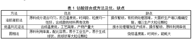 合成鈷酸鋰的常用方法有溶膠凝膠法、低溫共沉淀法及高溫固相法等。表1為鈷酸鋰合成方法及優(yōu)缺點(diǎn)。AbdulAziz等[6]通過溶膠凝膠法制備鈷酸鋰,應(yīng)用在硝酸鋰的水性電解液電池中也具有較高的初始比容量115.49mAh/g。Wu等[7]采用低溫共沉淀法合成鈷酸鋰,在3.0~4.5 V@1.0 C,100次循環(huán)可逆比容量為148 mAh/g。