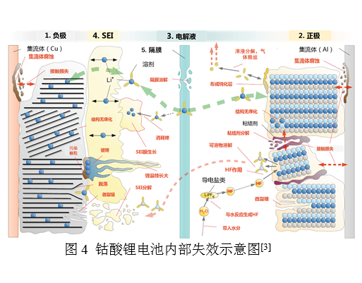 由于正極材料本身的局限性,高電壓下過量脫鋰導(dǎo)致層狀結(jié)構(gòu)不穩(wěn)定,產(chǎn)生體相結(jié)構(gòu)變化,伴隨著相變和體積變化,使得晶胞參數(shù)變化、晶界錯位、應(yīng)力變化、顆粒開裂,導(dǎo)致容量快速衰減;體相結(jié)構(gòu)體積變化影響到表面結(jié)構(gòu)變化,使得表面易產(chǎn)生裂紋,導(dǎo)致表面熱穩(wěn)定性減弱、金屬溶解、析氧等;表面結(jié)構(gòu)的變化伴隨著界面副反應(yīng)及氧的轉(zhuǎn)移,使得電解液氧化、內(nèi)阻增加、產(chǎn)氣、熱穩(wěn)定及安全性能下降等,導(dǎo)致一系列宏觀電池失效行為。在高電壓下相變的可逆程度是決定鈷酸鋰應(yīng)用的關(guān)鍵,而期望用單一的方法解決高壓鈷酸鋰的問題是不現(xiàn)實(shí)的。結(jié)合有效摻雜、共包覆、高壓電解液及新功能隔膜配套使用來緩解鈷酸鋰電池內(nèi)部失效,從而改善高壓鈷酸鋰[3]。圖4為鈷酸鋰電池內(nèi)部失效示意圖。