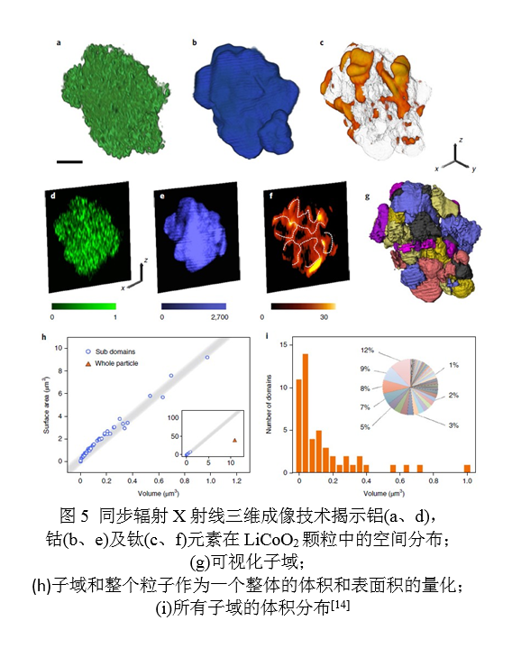 體相摻雜能夠穩(wěn)定材料結(jié)構(gòu),抑制不可逆相變,提高材料循環(huán)性能。體相摻雜包含:(1)低價陽離子摻雜:低價陽離子通常指價態(tài)不高于正三價的離子,主要有鋰空位、鋰離子、鎂離子、鋁離子、鋯離子等。A.R.West等[8]首次將鎂離子引入到鈷酸鋰中,認(rèn)為鎂離子摻雜更傾向于鈷的位置,使得鈷的價態(tài)提高,產(chǎn)生一種導(dǎo)入型P型半導(dǎo)體摻雜,同時產(chǎn)生部分鋰空位,能夠在一定程度上提高電子電導(dǎo),其研究成果對后續(xù)鎂離子摻雜起到引導(dǎo)作用。Delmas等[9]認(rèn)為只有鎂摻雜達(dá)到一定的量才能形成連續(xù)通道,表現(xiàn)出金屬特性區(qū)域,才會反應(yīng)出電子電導(dǎo)提升的現(xiàn)象。目前,二價鎂離子是工業(yè)生產(chǎn)最成功摻雜元素之一。三價元素?fù)诫s,主要分為無化學(xué)活性的硼、鋁、銥,有化學(xué)活性的錳、鎳、鉻等元素。G.Cede r等[10]通過理論計算預(yù)測及實(shí)驗證明鋁離子能夠有效提高鈷酸鋰在高壓下的循環(huán)性能及降低成本。Gopukumar等[11]將錳離子摻雜高壓鈷酸鋰中,并充電至4.5V,開創(chuàng)了錳離子在高壓鈷酸鋰中應(yīng)用的先河。三價元素?fù)诫s鋁離子是最成功的一員,鋁離子摻雜進(jìn)入材料晶胞,取代鈷離子的位置。鋁離子半徑與鈷離子相近,使得鋁離子更易均勻摻雜到鈷層中,并不影響鋰離子的傳輸,同時鋁離子不參與反應(yīng),起到穩(wěn)定骨架的作用;(2)高價陽離子摻雜:高價陽離子摻雜通常指價態(tài)高于正三價的離子,主要包括鈦、錳、鋯、鉬、鎢等離子。Gopukumar等[12]發(fā)現(xiàn)適量的鈦摻雜能提高材料的放電比容量,同時鈦元素的摻雜后能降低鈷的平均價態(tài),提高材料循環(huán)穩(wěn)定性。YongseonKim等[13]通過第一性原理計算及實(shí)驗驗證,鈦元素不容易摻雜到鈷酸鋰晶格,更容易富集在材料表面;(3)共摻雜:Zhang Jie Nan等[14]采用鈦、鎂、鋁痕量元素共摻雜,采用同步輻射X射線三維成像技術(shù)揭示鎂和鋁元素更容易摻雜進(jìn)入材料晶體結(jié)構(gòu)中抑制4.5V左右相變;鈦元素則傾向于界面和表面富集,提高倍率性能和降低表面氧活性;鈦、鎂、鋁痕量元素共摻雜在高電壓下具有優(yōu)異的首次效率,倍率性能及循環(huán)性能。ZhangJie Nan等從晶體結(jié)構(gòu)、電子結(jié)構(gòu)和材料亞微米尺度微觀結(jié)構(gòu)等不同維度對材料進(jìn)行綜合求證,為設(shè)計高電壓、高容量正極材料提供了理論依據(jù)。多種元素共摻雜越發(fā)成為高壓鈷酸鋰摻雜改性的一個發(fā)展方向。圖5為同步輻射X射線三維成像技術(shù)揭示鋁(a、d),鈷(b、e)及鈦(c、f)元素在LiCoO2顆粒中的空間分布;(g)為可視化子域;(h)為子域和整個粒子作為一個整體的體積和表面積的量化;(i)為所有子域的體積分布。