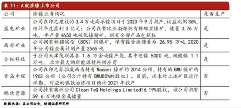 據(jù)財(cái)通證券李帥華9月28日?qǐng)?bào)告整理,A股涉鎳上市公司有:盛屯礦業(yè)、西部礦業(yè)、合縱科技、青島中程、鵬欣資源。