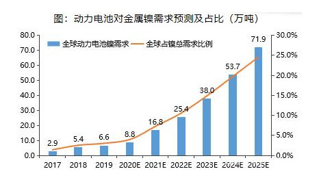 同為三元正極材料中的鎳,未來(lái)動(dòng)力電池領(lǐng)域?qū)ζ湫枨笸瑯釉鲩L(zhǎng)較快。鑒于動(dòng)力電池技術(shù)路線發(fā)展的趨勢(shì)是往高鎳方向走,未來(lái)高鎳正極材料中鎳的比例將逐步提升。數(shù)據(jù)顯示,到2025年全球動(dòng)力電池對(duì)鎳鹽(硫酸鎳)需求量將達(dá)333.2萬(wàn)噸,折合為金屬鎳的需求量將達(dá)71.9萬(wàn)噸,占全球鎳總需求的24.6%。