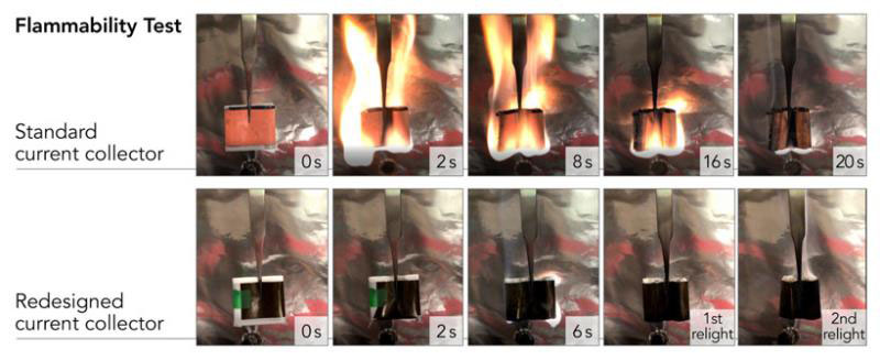 當(dāng)用如今的商用集電器做成的電池包被暴露在明火下時(shí),其會(huì)著火并劇烈燃料,直到電解質(zhì)全部燃燒殆盡。不過,在配備了新型阻燃劑集電器的電池中,火不會(huì)真正地燃燒起來,產(chǎn)生的火焰非常微弱,幾秒鐘內(nèi)就會(huì)熄滅,即使試圖重新點(diǎn)燃時(shí),也沒有再次燃燒起來。