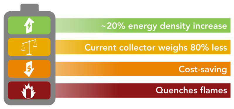 無論是圓柱形電池還是電池包,鋰離子電池都有兩個(gè)集電器,每個(gè)電極一個(gè),會(huì)分布流入或流出電極的電流。在一些大功率或超薄電池中,此類集電器的重量占到15%至50%。減少電池的重量一方面可以讓設(shè)備更輕,減少電動(dòng)汽車的重量;此外還能夠在特定重量內(nèi)存儲(chǔ)更多的能量,讓電子設(shè)備和電動(dòng)汽車都可以具備更長的續(xù)航時(shí)間。減少電池的重量以及易燃性也可以降低運(yùn)輸回收電池的成本,對(duì)電池回收也會(huì)有很大的影響。