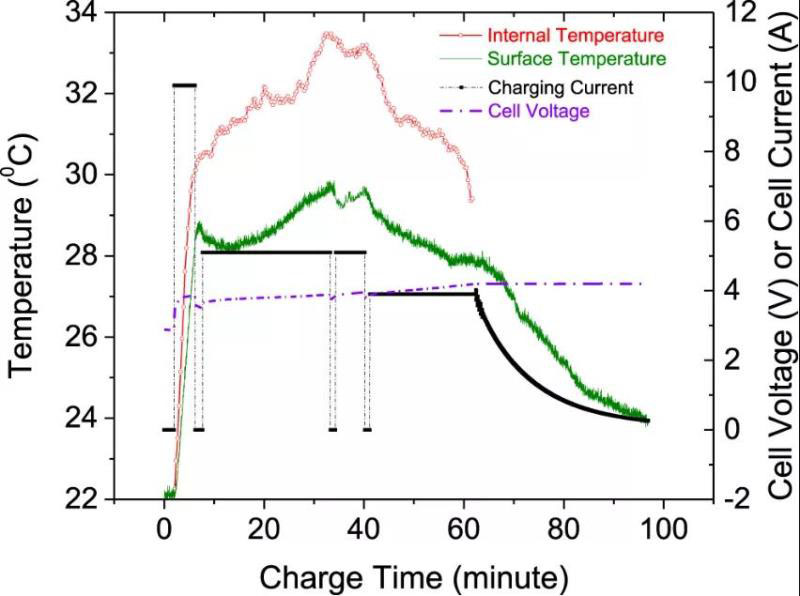 如圖4所示為快速充電的例子,利用電池內(nèi)部溫度來決定充電的過程。電池快速充電不僅方便了電動汽車,而且在電網(wǎng)應(yīng)用中也是必不可少的。它也是一個操作參數(shù),可以增加電池內(nèi)部溫度,潛在地加速電池老化,推動它進(jìn)入TR和排氣。試圖使用表面溫度作為參數(shù)來保護(hù)電池不排氣可能會產(chǎn)生誤導(dǎo),因此是有害的。圖4中的數(shù)據(jù)是由電池中的一個電池單元(5.3 Ah),開始以接近2 C的速率充電。這個例子中的電池通常以0.7 C的速率充電,完全放電后大約需要120 min才能充滿。當(dāng)溫度提高到35℃以上時,iPROUD將電流轉(zhuǎn)換為零,使電池內(nèi)部冷卻,并在其他時間將充電速率限制在0.7 C和0.5 C,電池完全充電的總時間是95 min。相反,如果選擇電池表面溫度作為參數(shù),并將其限制設(shè)置為35℃以切斷電流,則溫度會增加到一個更高的值,會加速電池老化,導(dǎo)致電池?zé)崾Э?。iPROUD將溫度和電池電壓作為控制參數(shù),通過電池的電解質(zhì)和電荷轉(zhuǎn)移電阻以及庫侖容量以改善電池管理,從而獲得更高的安全性、長壽命以及能量存儲和動力傳輸效率。
