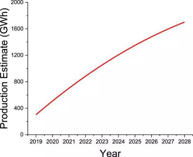 圖1. 未來十年鋰電池全球產(chǎn)量的預(yù)期增長。