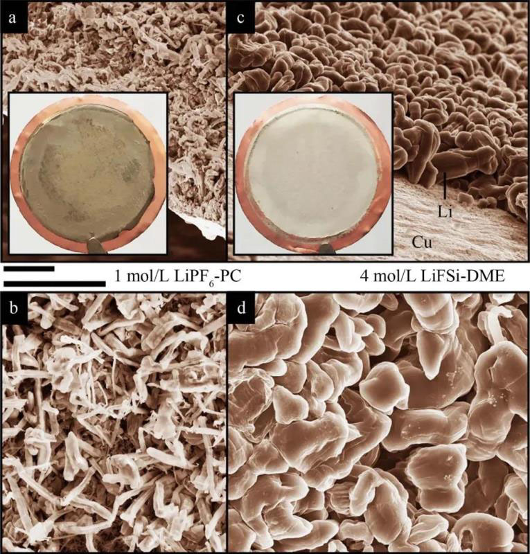 圖7 在(a,b)1 mol/L LiPF6-PC和(c,d)4 mol/L LiFSI-DME電解液中,沉積在銅基底上的鋰金屬形貌的SEM圖;內(nèi)插圖(a,c)中的銅基底直徑為2 cm;標(biāo)尺為10 mm