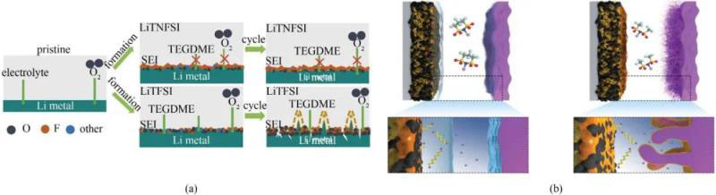 圖6 (a)鋰金屬在LiTNFSI/TEGDME和LiTFSI/TEGDME電解液中的反應(yīng)過程;(b) LiHFDF抑制鋰枝晶生長和多硫化鋰溶解/穿梭的示意圖