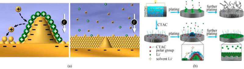 圖5 (a)基于SHES機(jī)理的鋰沉積過程;(b)陽離子表面活性劑CTAC在鋰沉積過程中的作用機(jī)理