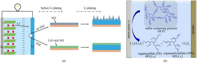 圖4 (a)加入或不加FEC的1.0 mol/L LiPF6/EC-DEC (體積比1∶1)電解液體系對鋰金屬負(fù)極的效果;(b) SCP分解后能提供有機(jī)組分(有機(jī)硫/有機(jī)聚硫化物)和無機(jī)組分(二硫化鋰/硫化鋰)的示意圖