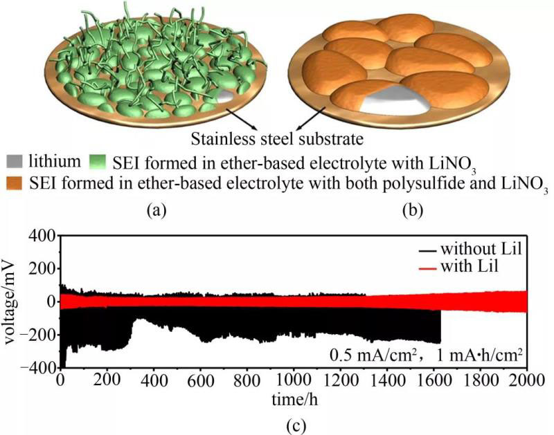 圖3 在(a)不含多硫化鋰和(b)含多硫化鋰的兩種電解液(均含有硝酸鋰)中,不銹鋼基底上鋰沉積形貌的示意圖;(c)在0.5 mA/cm2電流密度下,鋰鋰對稱電池在不同電解液中的循環(huán)穩(wěn)定性