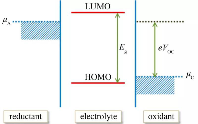 圖2 電極和電解液無反應(yīng)時(shí)電解液(固體電極體系的液體電解液)窗口Eg和電極電化學(xué)電位μA和μC的相對能量