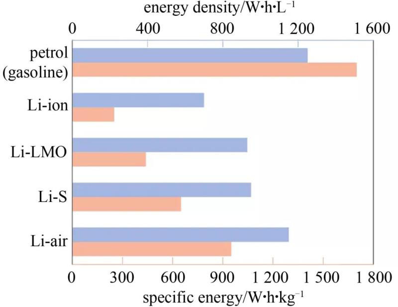 圖1 汽油、最先進(jìn)的鋰離子電池及3種鋰金屬電池的實(shí)際比能量(粉紅色)和能量密度(藍(lán)色)對比