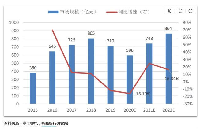 該機(jī)構(gòu)認(rèn)為,單車帶電量的提升有望對沖掉動力電池售價的下降,動力電池市場規(guī)模隨銷量的增加而呈上升的趨勢,預(yù)計2022年有望達(dá)860億,約為2019規(guī)模的1.2倍。