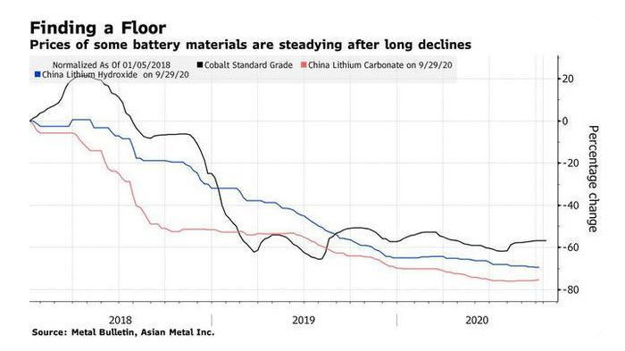 由于電池生產(chǎn)商爭相提供更多供應量,鋰化學品的價格從2018年中期開始暴跌,遠遠超出了需求增長的幅度。近期研究報告顯示,盡管近幾個月來鋰化學品的體系水平僅為峰值的一半左右,但這些材料已經(jīng)趨于穩(wěn)定。
