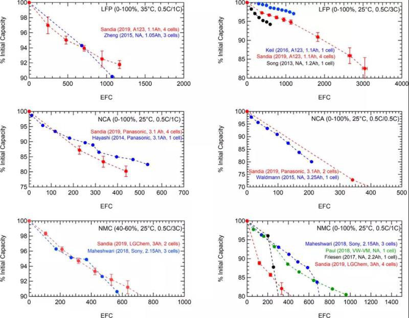 圖6. 研究之間電池循環(huán)容量衰減的比較。每個(gè)圖中標(biāo)出化學(xué)和循環(huán)條件, DOD,溫度和充放電速率。對(duì)于每個(gè)數(shù)據(jù)集,記錄了發(fā)布年份,電池制造商,電池容量以及在指定條件下循環(huán)的電池?cái)?shù)量。