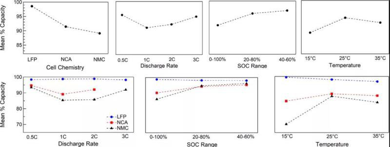 將NMC,NCA和LFP商用鋰離子電池在不同的溫度,放電深度和放電速率下循環(huán),比較了容量和放電能量保持率以及充放效率。通過(guò)定性和方差分析對(duì)每個(gè)循環(huán)變量的依賴性進(jìn)行了分析。這項(xiàng)工作的主要結(jié)論包括: