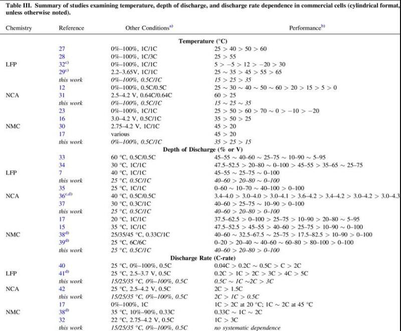 表III. 研究溫度,放電深度和商用電池放電速率依賴性的研究列表。