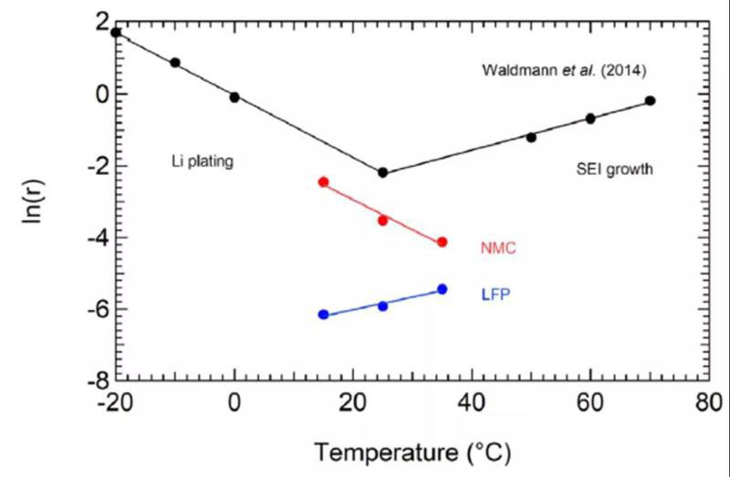 圖4. 電池容量衰減率的阿倫尼烏斯圖。實(shí)線對(duì)應(yīng)于數(shù)據(jù)的線性擬合。黑色對(duì)應(yīng)于Waldmann等人的數(shù)據(jù)。