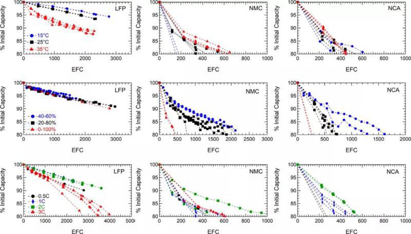 圖2a EFC為每個(gè)電池特定循環(huán)條件下達(dá)到80%的容量。對(duì)于尚未達(dá)到80%容量的LFP電池,根據(jù)當(dāng)前衰減率外推壽命。三種化學(xué)成分對(duì)溫度,DOD或放電速率沒(méi)有普遍的依賴性。因此下文將對(duì)變量的依賴性進(jìn)行更系統(tǒng)的分析。