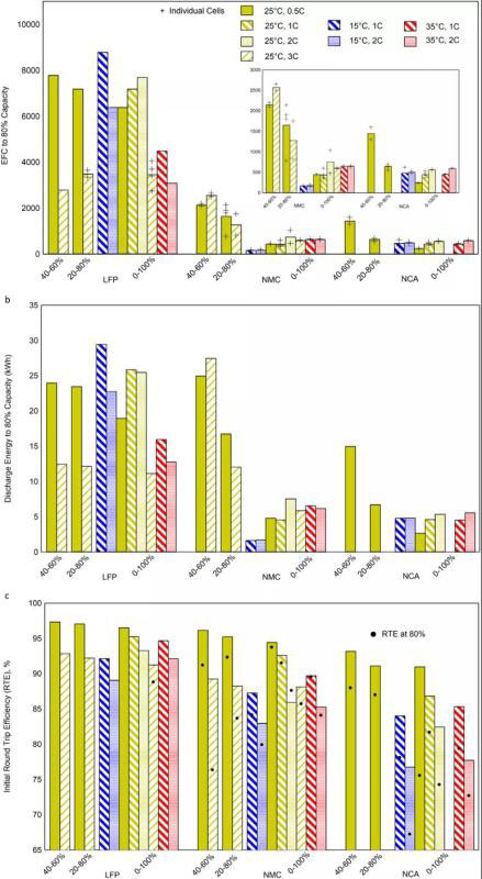 圖2.(a)所有電池和循環(huán)條件下的等效全周期(EFC)計(jì)數(shù)為80%容量。每個(gè)條表示在該條件下循環(huán)的所有電池的平均EFC。(b)所有電池和循環(huán)條件下80%容量的累積放電能量。每個(gè)條表示在該條件下循環(huán)的所有電池的平均放電能量。(c)所有電池和循環(huán)條件的往返效率(RTE)。每個(gè)條形表示在該條件下循環(huán)的所有電池的平均初始RTE。