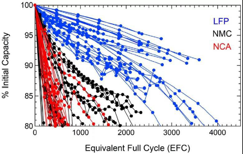 圖1. 所有LFP(藍(lán)色),NMC(黑色)和NCA(紅色)電池的放電容量保持率。圓點(diǎn)是每輪循環(huán)容量檢查的數(shù)據(jù)點(diǎn)。