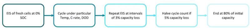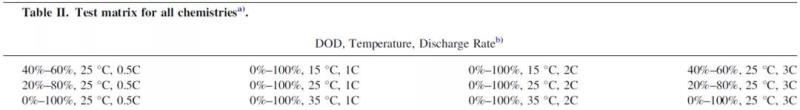 表二列舉了這項(xiàng)研究中檢查的溫度,DOD和放電電流的組合。這些值是根據(jù)實(shí)驗(yàn)方法的設(shè)計(jì)選擇的,以便涵蓋制造商建議的參數(shù)范圍,并確定對(duì)每個(gè)變量的依賴性。為確??芍貜?fù)性,每個(gè)測(cè)試均使用至少兩個(gè)電池進(jìn)行。