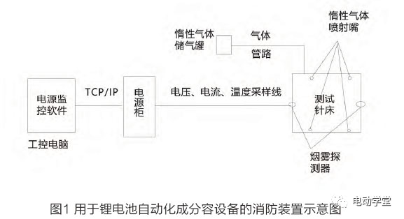 循環(huán)設(shè)備前后方各一個(gè)煙霧探測(cè)器,電芯殼體溫度檢測(cè)探頭(內(nèi)置于測(cè)試針床),電壓電流溫度采樣線,惰性氣體噴射嘴(噴射1230滅火劑),測(cè)試針床的上下夾具接口設(shè)置有可自動(dòng)閉合的消防門即設(shè)備門,消防門閉合后針床內(nèi)部可形成一個(gè)與外界完全隔絕的環(huán)境。設(shè)備外部配備1230自動(dòng)滅火系統(tǒng),應(yīng)對(duì)電芯冒煙起火的自動(dòng)響應(yīng)。