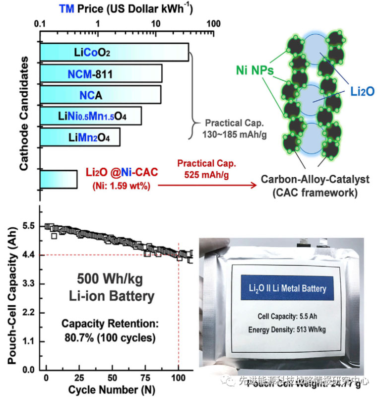 南京大學(xué)Haoshen Zhou教授研究團(tuán)隊(duì)設(shè)計(jì)開發(fā)了一種穩(wěn)定的、大容量基于陰離子氧化還原活性的正極材料體系,應(yīng)用于鋰金屬(Li)軟包全電池,通過氧化鋰(Li2O)與過氧化鋰(Li2O2)之間的可逆轉(zhuǎn)化,顯著提升了電池器件的性能,首次獲得了超越500 Wh/kg的能量密度,且電池穩(wěn)定循環(huán)100余次后仍可獲得大于400 Wh/kg的能量密度,更為關(guān)鍵的是該電池鎳金屬的含量?jī)H為1.59%(質(zhì)量分?jǐn)?shù)),遠(yuǎn)低于傳統(tǒng)的高鎳三元正極,成本更低更適于規(guī)?;a(chǎn),對(duì)電池產(chǎn)業(yè)和電動(dòng)汽車發(fā)展具有重要推動(dòng)作用。相關(guān)的研究表明,在Li金屬電池正極材料的設(shè)計(jì)過程中,不局限于傳統(tǒng)過渡金屬氧化還原提供容量,利用Li2O與Li2O2之間的可逆轉(zhuǎn)化,能夠?yàn)檎龢O體系提供很高的能量密度。理論計(jì)算得知,Li2O/Li2O2轉(zhuǎn)化的理論能量密度高達(dá)2565 Wh/kg。為此研究人員利用濕化學(xué)法制備了Li2O基正極材料,同時(shí)為了提升無氧氣析出的“安全”充電深度,研究人員同時(shí)制備了匹配的鎳基碳合金導(dǎo)電催化框架(Ni-CAC)包覆Li2O形成Li2O@Ni-CAC電極體系,一方面有助于提升電池性能,另一方面有利于減少鎳金屬使用量降低成本。接著以Li2O@Ni-CAC和Li為正負(fù)極,醚類溶劑為電解質(zhì)組裝成完整的軟包電池,并開展電化學(xué)性能測(cè)試。原位氣相質(zhì)譜和拉曼光譜實(shí)驗(yàn)顯示,在充電過程中存在明顯的Li2O向Li2O2的轉(zhuǎn)化過程,且Li2O@Ni-CAC電極體系的可逆“安全”充電深度為750 mAh/g(基于Li2O活性物質(zhì)質(zhì)量),一旦超過這一數(shù)值就會(huì)出現(xiàn)不可逆的氧氣析出。隨后控制充電深度不超過750 mAh/g,進(jìn)行充放電循環(huán)測(cè)試,發(fā)現(xiàn)電池可以穩(wěn)定可逆循環(huán)100余次,且能量密度高達(dá)950 Wh/kg(考慮到所有電極材料質(zhì)量的前提下,但不包括軟包外殼);而在計(jì)入軟包外殼后,電池依然獲得了超越500 Wh/kg的能量密度,達(dá)到了513.5 Wh/kg,這是目前文獻(xiàn)報(bào)道的能量密度最高的軟包電池(計(jì)入整個(gè)軟包電池質(zhì)量后),且電池穩(wěn)定循環(huán)100余次后,輸出能量密度仍然高于400 Wh/kg,表現(xiàn)出優(yōu)異的循環(huán)穩(wěn)定性。