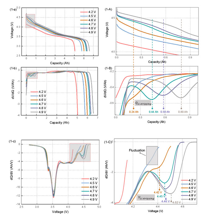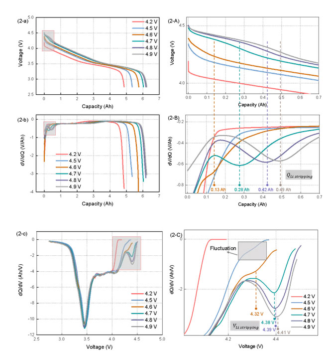 圖 1展示了在0.2 C和0.5 C放電4.2 V,4.5-4.9V下,電壓與容量的關(guān)系、差分電壓和差分容量的結(jié)果。以0.5 C為例進行分析:從圖 1(2-a/A)中可以看出,4.7 V,4.8 V和4.9 V三個過充截止電壓下在放電初期出現(xiàn)了一段高電壓平臺,我們認(rèn)為是鋰溶解電壓平臺,對放電曲線進行差分電壓和差分容量,如果二者出現(xiàn)極小值,則說明發(fā)生析鋰。