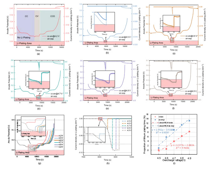 (g)–(h): 各個電壓下負(fù)極-隔膜界面的負(fù)極電位(g)和析鋰電流密度(h) ((a)–(f)的總結(jié));
