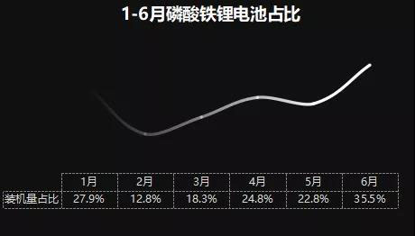 1-6月,受疫情影響,磷酸鐵鋰電池裝機(jī)量占比有所下降,但進(jìn)入第二季度,占比回升,6月達(dá)到35.5%。相比2019年6月磷酸鐵鋰電池裝機(jī)量的占比只有25.68%,今年6月占比提高了近10%。