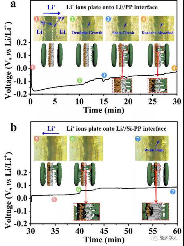 圖3. 在電流密度為2.0mA cm-2的沉積/剝離測試過程中,帶有單面Si涂層PP隔膜的透明電池中的形貌演變和電壓曲線:(a)0?30分鐘,Li+朝著沒有硅涂層的一側(cè)轉(zhuǎn)移;(b)30?60分鐘,Li+朝著有硅涂層的一側(cè)轉(zhuǎn)移。
