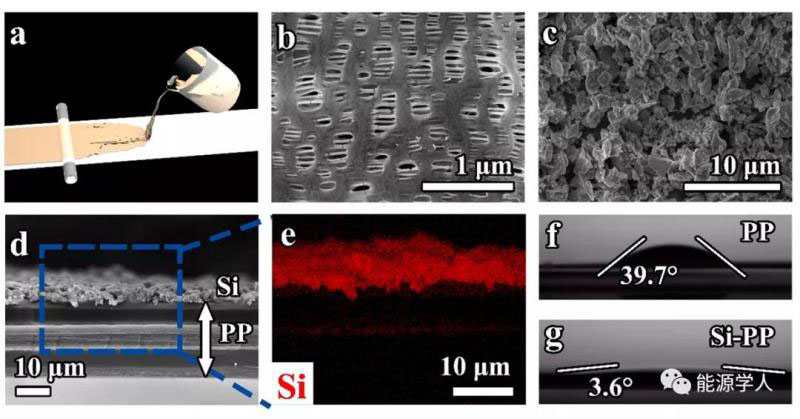 圖1. Si-PP隔膜的制造及其特性:(a)Si-PP隔膜的制造過程示意圖;(b)PP隔膜和(c)Si-PP隔膜的SEM俯視圖;(d)Si-PP隔膜的SEM截面圖和(e)相對應的Si分布的EDX元素圖;碳酸酯類電解液與(f)PP或(g)Si-PP隔膜之間的接觸角。