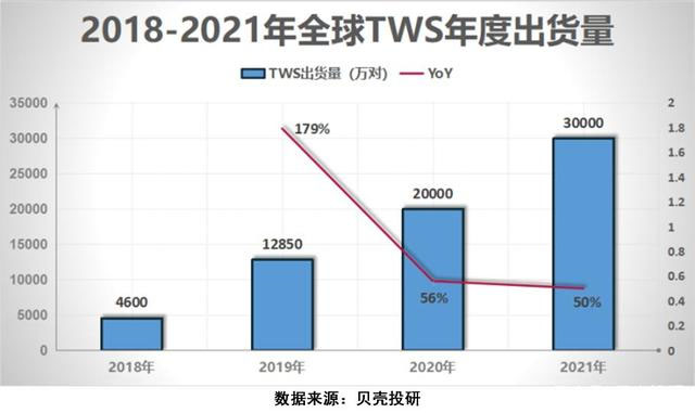 據(jù)行業(yè)數(shù)據(jù)顯示,2019年TWS市場(chǎng)高增,全年全球TWS出貨1.29億臺(tái),同比增長(zhǎng)179%,預(yù)計(jì)2020年出貨2億臺(tái),同比增長(zhǎng)56%。