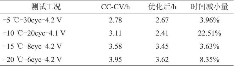 對于充電時間的數(shù)據(jù)對比如表5所示,從表中可以看出4組充電工況下,充電時間相比傳統(tǒng)CC-CV都得到了優(yōu)化,其中-10 ℃條件下充電時間相比傳統(tǒng)CC-CV充電方式減少22%,-5 ℃和-15 ℃為3%,-20 ℃工況下充電時間減少8%。