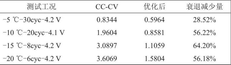 由仿真數(shù)據(jù)可以得到,4組測試工況,在達(dá)到充電截止電壓前用遺傳算法進(jìn)行充電策略優(yōu)化,與傳統(tǒng)CC-CV充電條件下容量衰退數(shù)據(jù)對比如表4所示。從表中可以看出,經(jīng)過遺傳算法對充電策略進(jìn)行優(yōu)化后,低溫下單次有效充電循環(huán),電池老化速率相比傳統(tǒng)CC-CV充電方式減少28%以上,最高可達(dá)64%,可見對充電策略的優(yōu)化能夠明顯減少低溫充電導(dǎo)致的電池容量衰退。