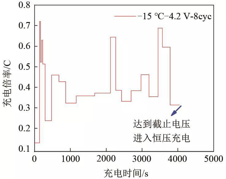 充電策略的驗(yàn)證選擇-15 ℃-8cyc-4.2 V工況進(jìn)行測試,充電控制器的實(shí)驗(yàn)充電曲線如圖18所示。