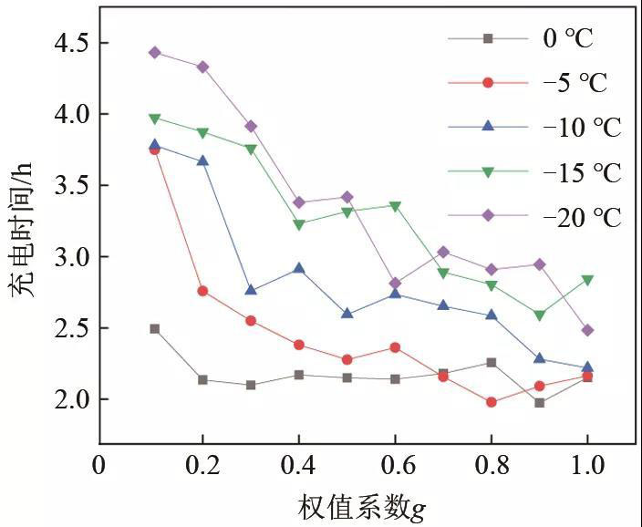 通過圖12可以看出,隨著權(quán)值系數(shù)g的增大,充電策略對充電時間的優(yōu)化力度加大,所以各個溫度段的充電時間逐漸減少。其中-10 ℃的曲線波動情況較大,可能跟容量衰退的建模有關(guān),也可能是實(shí)驗(yàn)測試設(shè)備出現(xiàn)了的測量誤差等原因造成的。但可以明顯看出有整體下降趨勢。